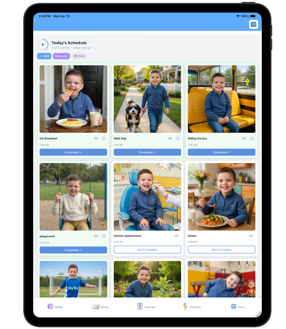 VizyPlan is a visual schedule and planning app designed for children with autism, ADHD, and other neurodivergent needs. Create personalized visual routines using AI-generated images of your child, track emotions and activities, prepare for IEP meetings with built-in advocacy tools, and help your family navigate daily transitions with less stress. Trusted by parents, therapists, and educators.